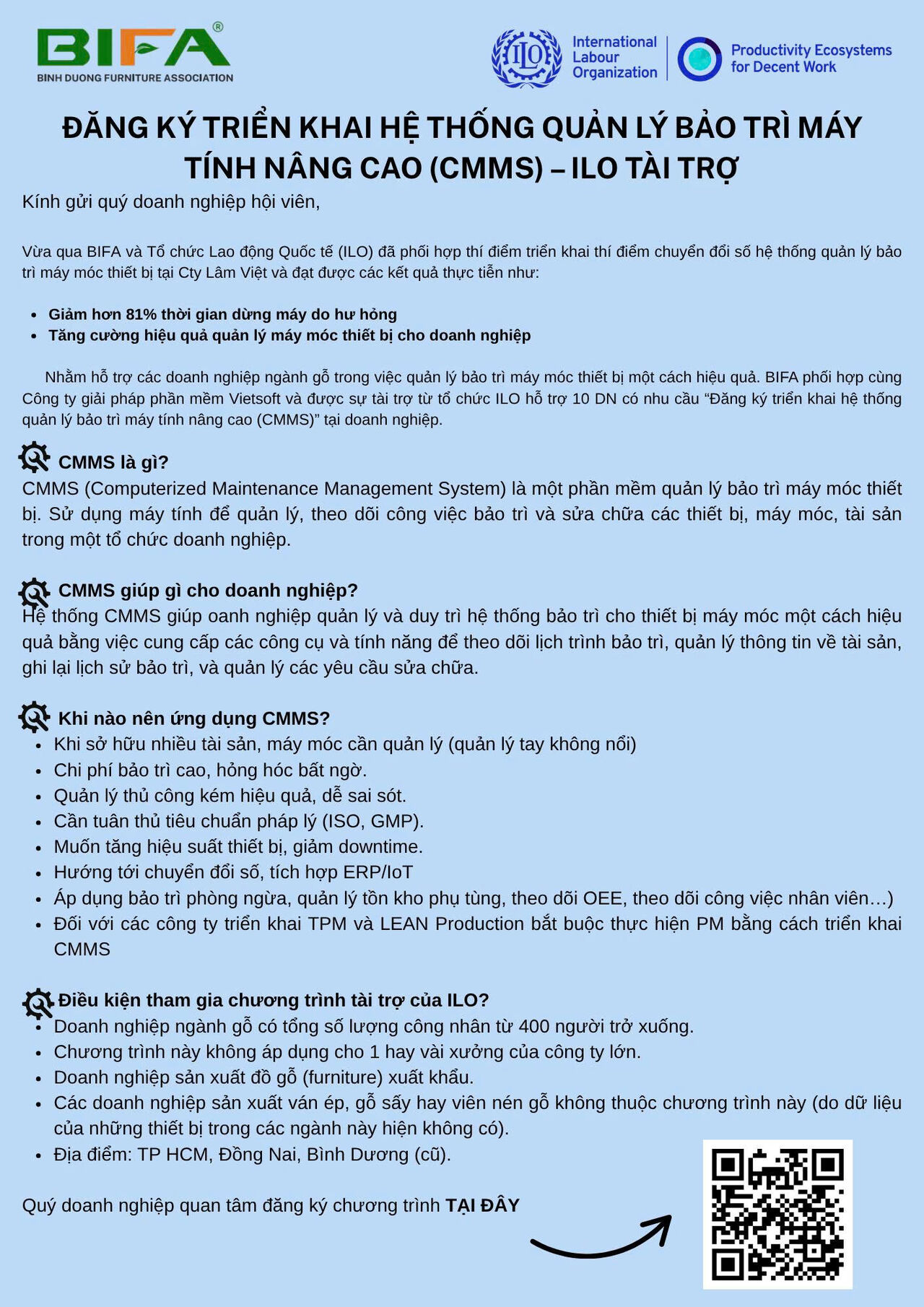 The Binh Duong Furniture Association (BIFA), in collaboration with the International Labour Organization (ILO) and Vietsoft Software Solutions Company, is excited to announce a new opportunity for wood industry enterprises. Following a successful pilot implementation at Lâm Việt Company, we are now offering 10 enterprises the chance to implement a digitized Computerized Maintenance Management System (CMMS) with full sponsorship from the ILO.